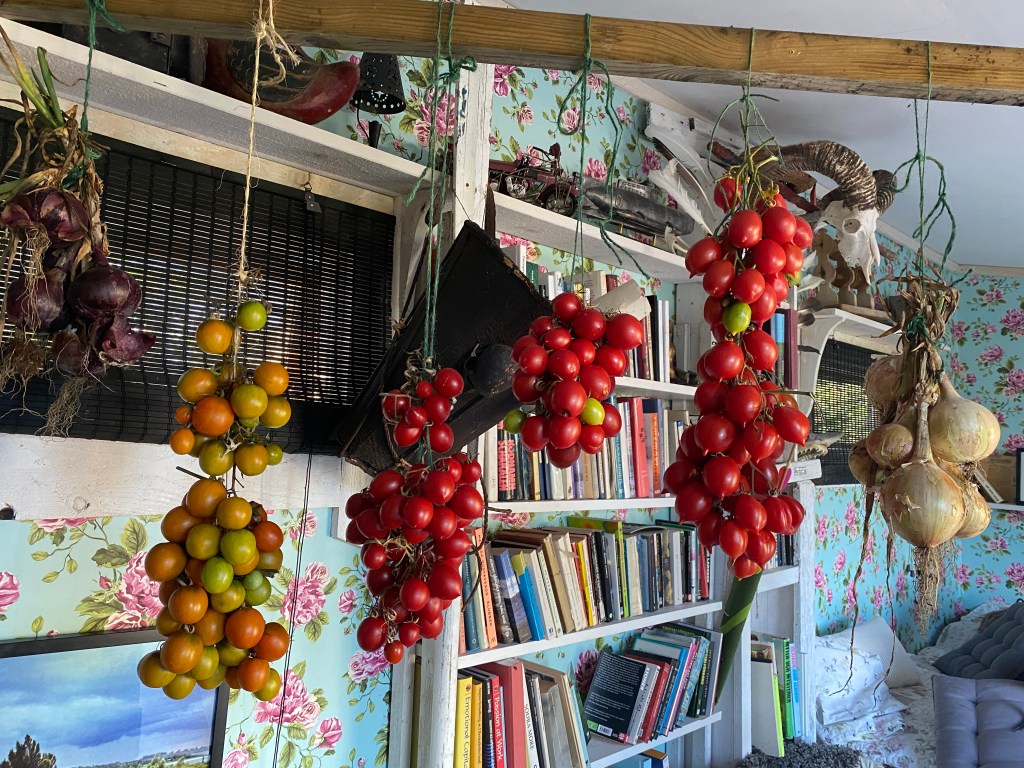 Hon: nu fick mina piennolo-tomater och all lök flytta in i friggeboden från husväggen ute. Lite för sent egentligen, skyfallet som kom i söndags och heldagsregnet i måndags gjorde dem ju knappast gott. Får se hur de klarar sig i friggan…
