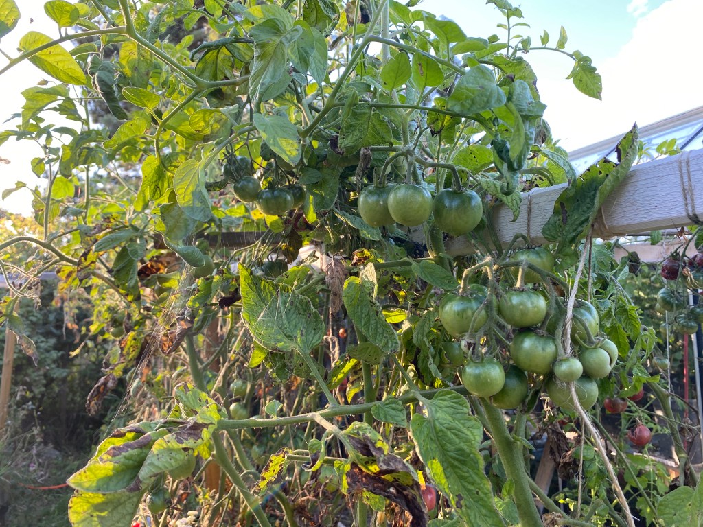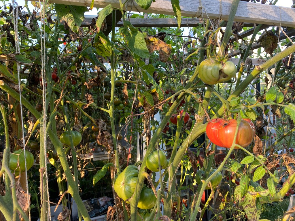 Trädgården, eller vad vi nu ska kalla vår vildvuxna och vindpinade udde, är en ruin. Tomatplantorna är som vanligt så här års gråmögelangripna, men ger fortfarande frukt, och borde alltså ansas. Och tomater skördas och tas om hand.