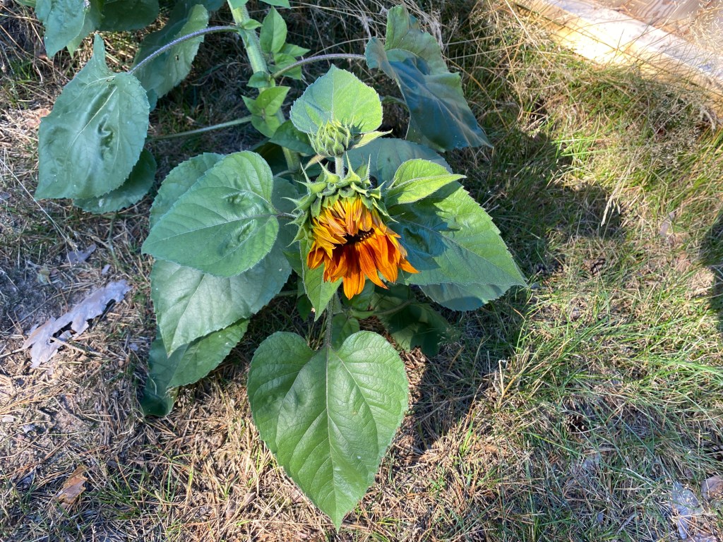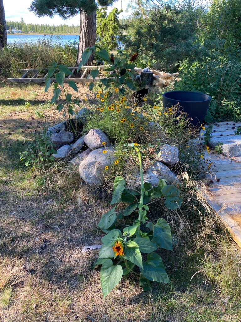 Sen vattna. Upptäcker att den höga solrosen bakom Chateau Margareta inte har orkat stå emot vinden och ligger ner, men den verkar inte speciellt ledsen för det, utan blommar på ändå och är snart helt utslagen. Och den har dessutom fler knoppar på gång.
