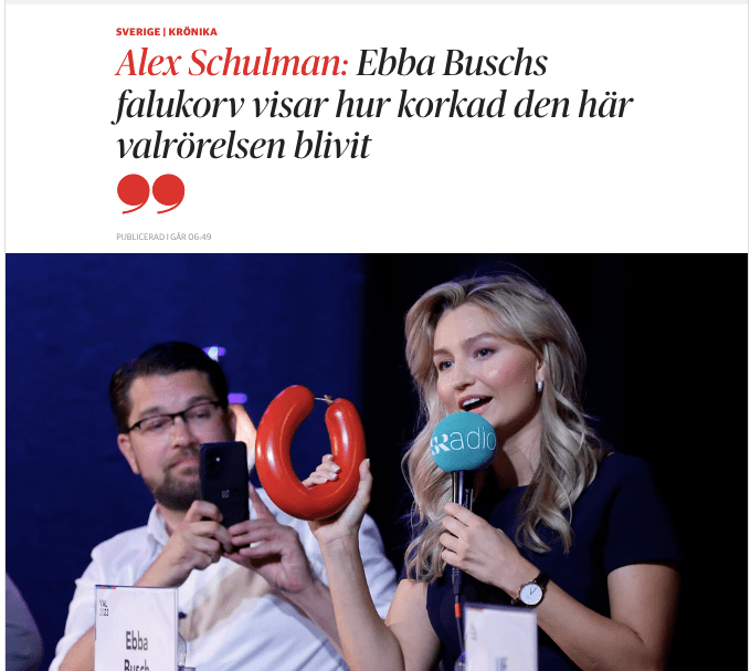 Den gode Alex Schulman å sin sida ”mår dåligt” när han ser falukorven (”modell större”) i Ebba Busch hand. ”När man trodde att valrörelsen inte kunde bli dummare, då tar Ebba Busch fram falukorven … Jag får en dålig reaktion, jag mår dåligt när jag ser den, känner mig svag och hjälplös.”