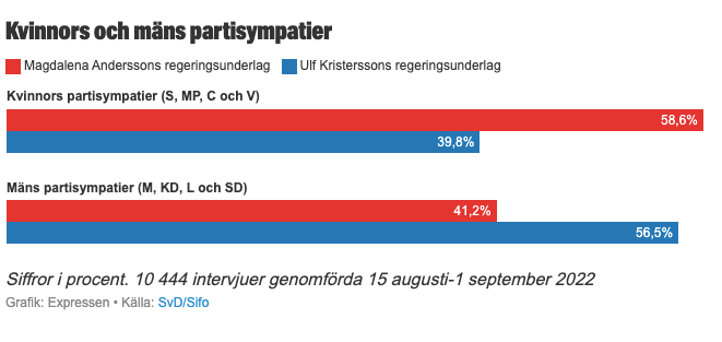 – Om bara kvinnor röstar på söndag skulle Socialdemokraterna och Vänsterpartiet i princip få egen majoritet. Om bara män fick rösta skulle Sverigedemokraterna och Moderaterna få majoritet.