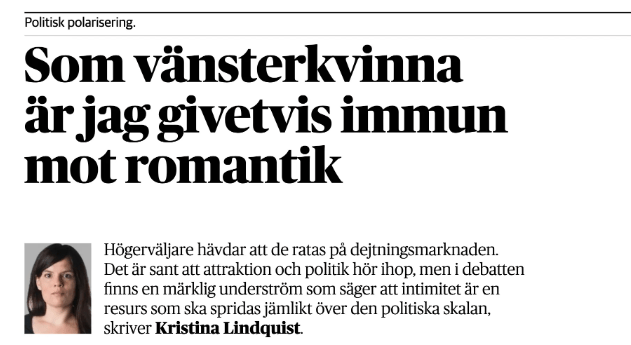 ”Det är lättare att vara vänster än höger, åtminstone om man ser till hur mycket man känner sig nödgad att självcensurera”, skriver Arpi och menar att hans iakttagelse återspeglar en mer grundläggande förändring: ”Män och kvinnor glider ifrån varandra alltmer i sina politiska sympatier.”
