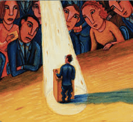 Han: Så står vi här igen, fyra år senare. För första gången i Bergkvara skola, matsalen. Vi köar, nickar åt grannar och bekantas bekanta.