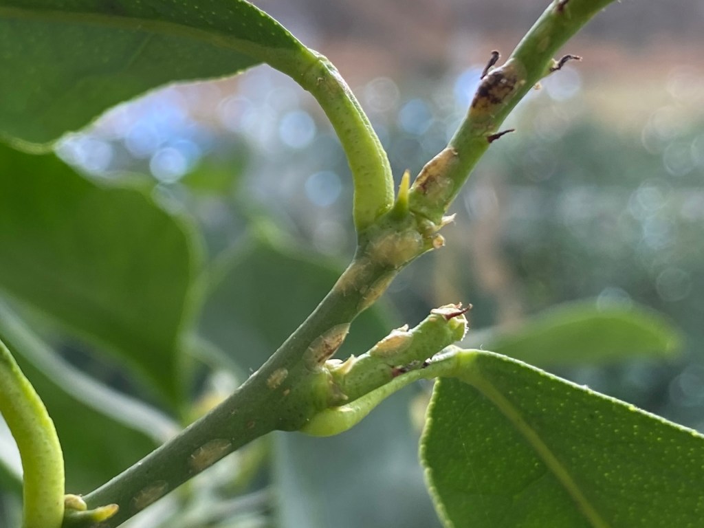 Tar en och annan sköldlus då och då när jag vattnar, den är inte helt översållad som förra hösten eftersom jag håller efter den bättre. Men hittade många på rad på en ung och fin gren ändå.