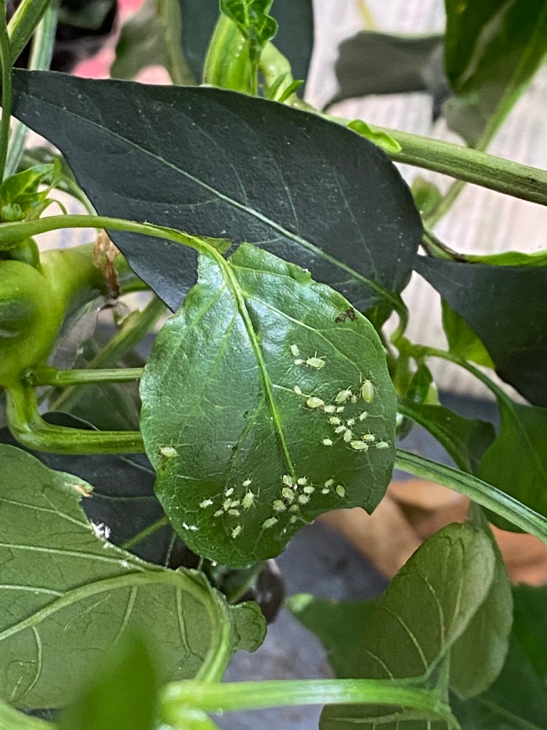 Och helt plötsligt ser jag att chiliplantan som står under citronträdet är helt full med bladlöss. Jag som varit så glad för att jag sluppit dem i år. Men nu kom de. Fast hittade inte direkt några någon annanstans. Pust! Chiliplantan är nu avspolad med både vatten och såpalösning. Den fick ny kruka med mer jord också. Den har helt klar fått för lite kärlek. Det straffar sig!