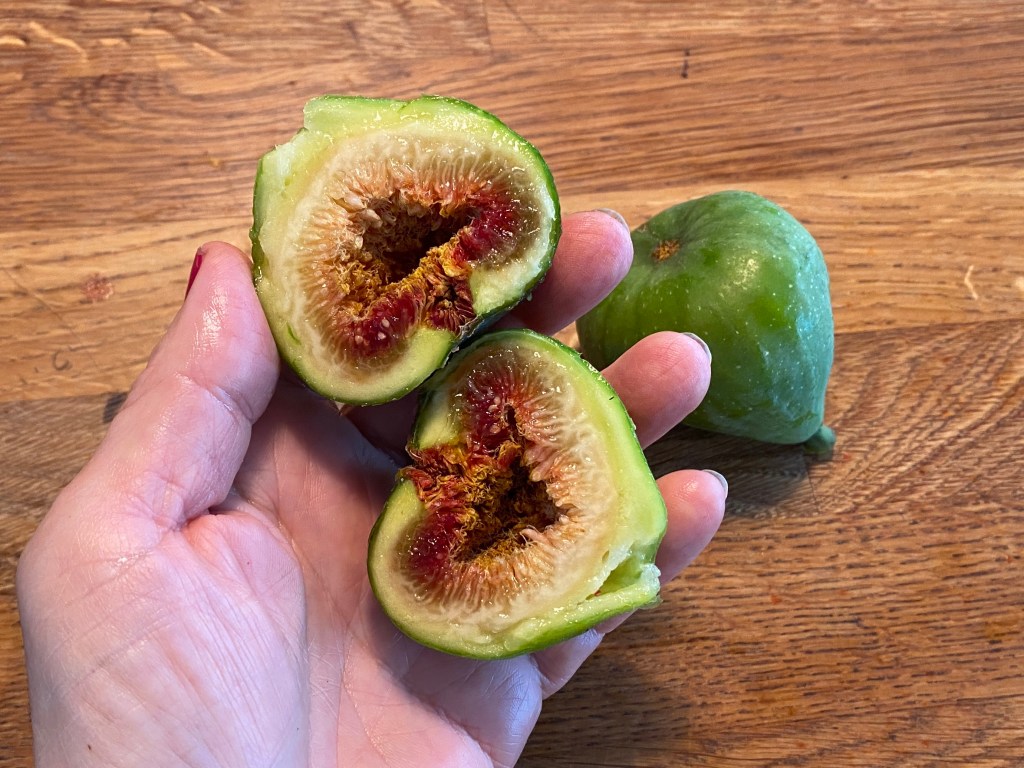 Kollade in växthusen också. Vattnade lite trots skyfallet som varit. Regnar ju inte in men det är så fuktigt att det inte direkt behövde vattnas alls. Skördade två fikon utanför Chateau Margareta också. Såååååå himla goda!