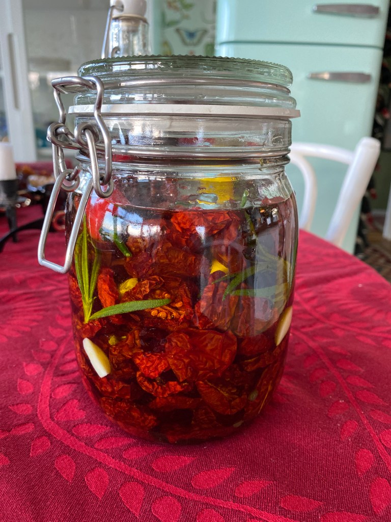 Och så la jag in vintertomaterna jag gav upp på och torkade i ugnen häromdagen i olja och lite vinäger. Kryddade med färsk chili, rosmarin, vitlök och några kapris. Förra burken blev kanongod, hoppas jag lyckades med denna också.