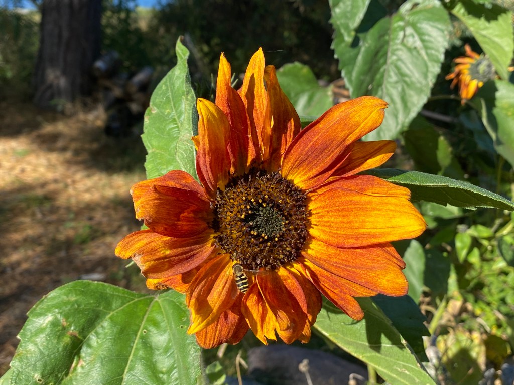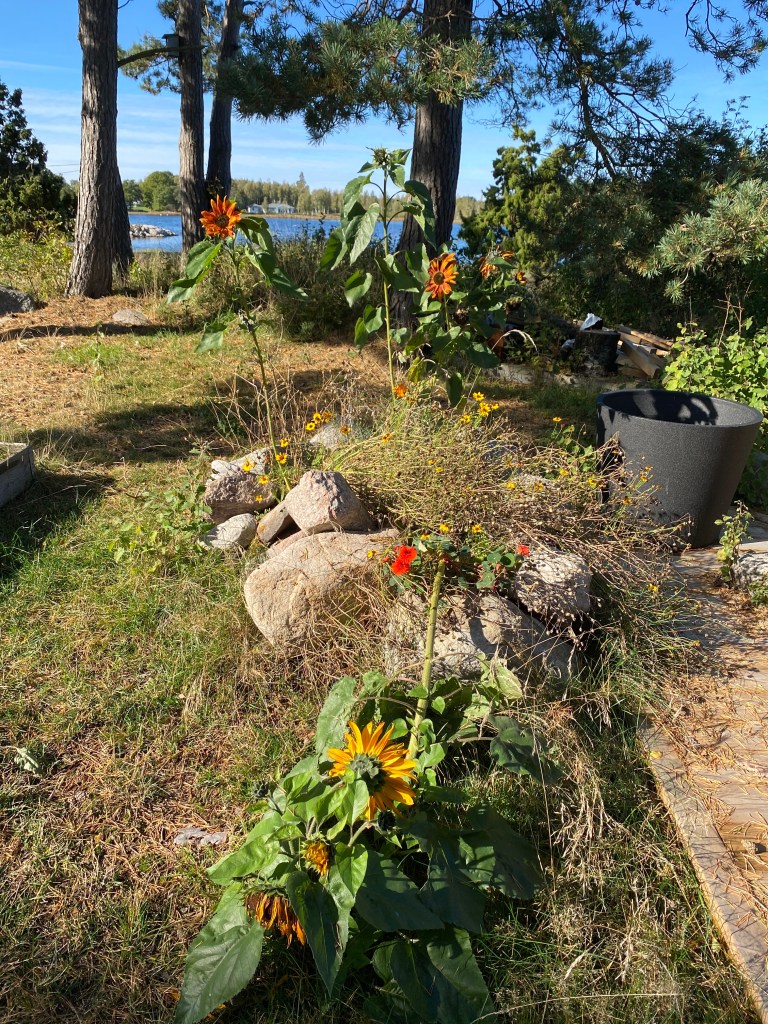 Hon: solrosorna bakom Chateau Margareta bara blommar och blommar. De har flera knoppar på varje stjälk, så kul! Och den tunga, långa som föll vid den första höststormen har inte heller gett upp. Och våra flitiga bin har verkligen inte gjort det. Inne i växthusen surras det och arbetas för fullt. Av bina alltså…