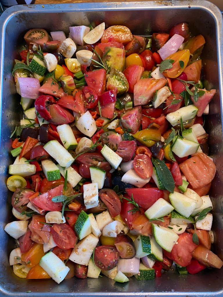 Och så ut och skörda zucchini, aubergine och de tomater som fortfarande är okej. Vitlök, lök, paprika, chili, salvia, rosmarin, oregano och timjan. Och så skjuts in i ugnen…