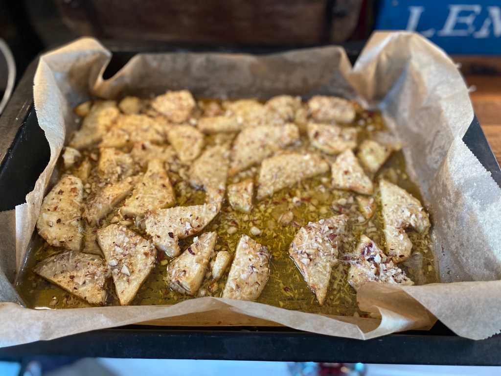 Jättegott tillbehör till korv. Gratinerade med fetaost och lite honung. Drog också upp två rotselleri, de är inte stora än, och när rötterna är borttagna blir det bara en fingertutt kvar…