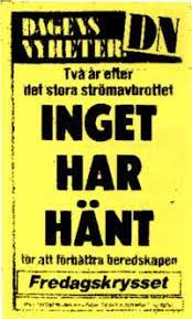 Dagens Nyheters löpsedel med feta bokstäver följande nyhet: INGET HAR HÄNT. Kunde återanvändas.