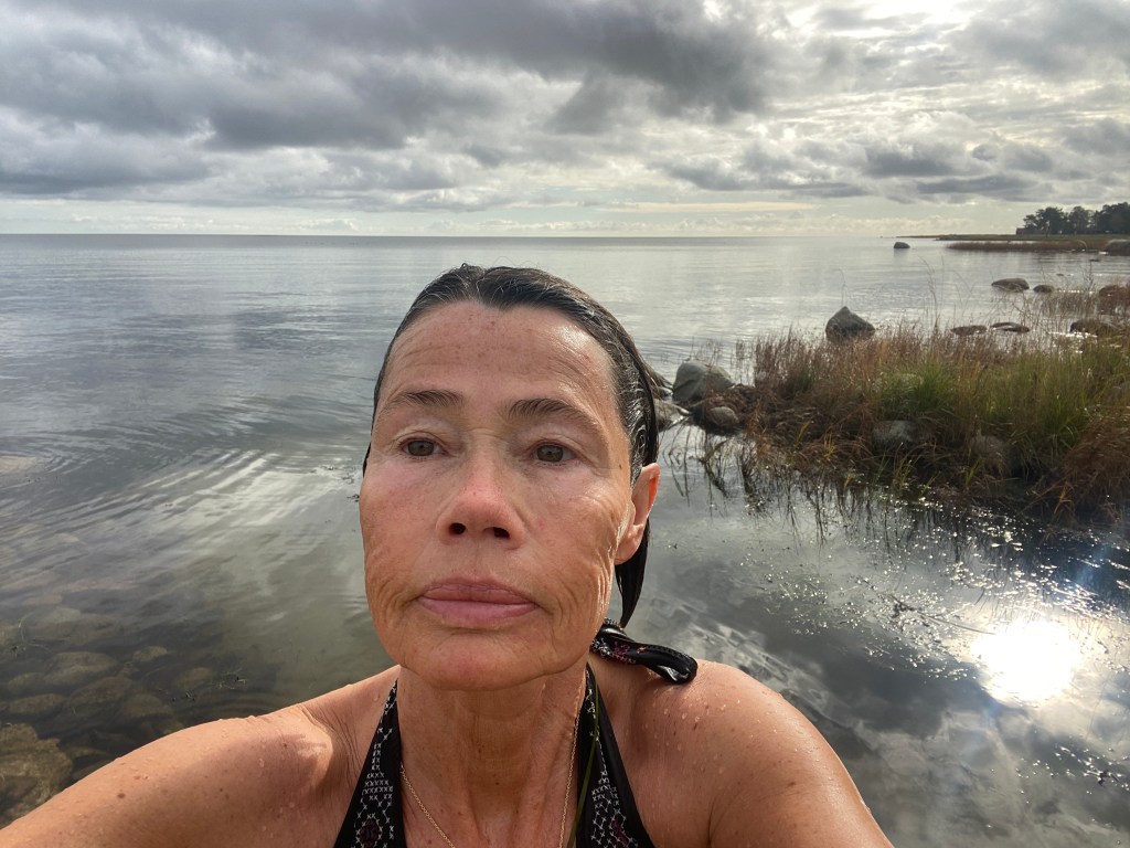 Det var jätteskönt!! Doppade mig, även huvudet, två gånger. Var nog inte sista gången i år. Vattnet var klart och botten hård sand, bättre än i augusti…