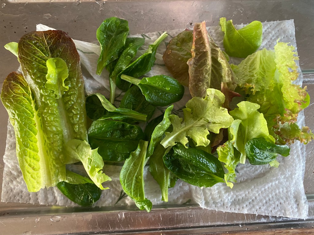 Hon: har fortfarande lite olika salladssorter att plocka ihop till frukostmackorna ute i pallkragarna. Tomatplantorna klippte jag däremot ner idag. Tog in de gröna som verkade okej. Har en hel del härinne nu…