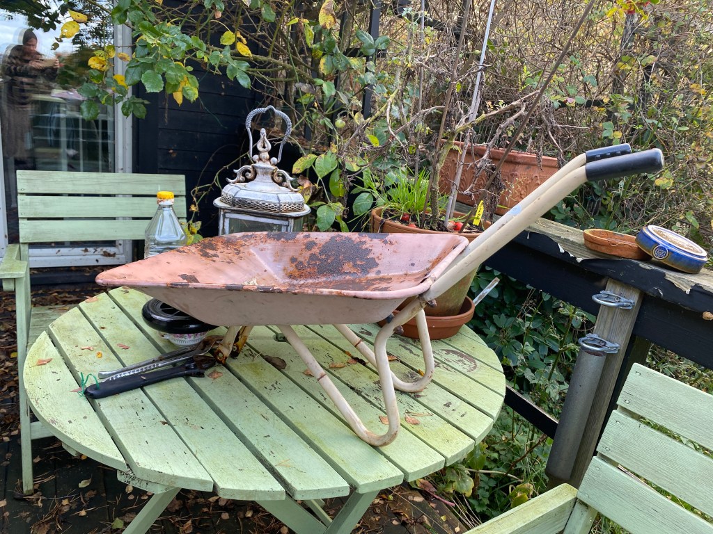 Hon: I veckan fyndade jag en liten skottkärra för 40 kronor på Vågen (loppis) i Bergkvara. Tänkte att Iggy kan hjälpa farmor att forsla tång till pallkragarna när han kommer i nästa vecka.