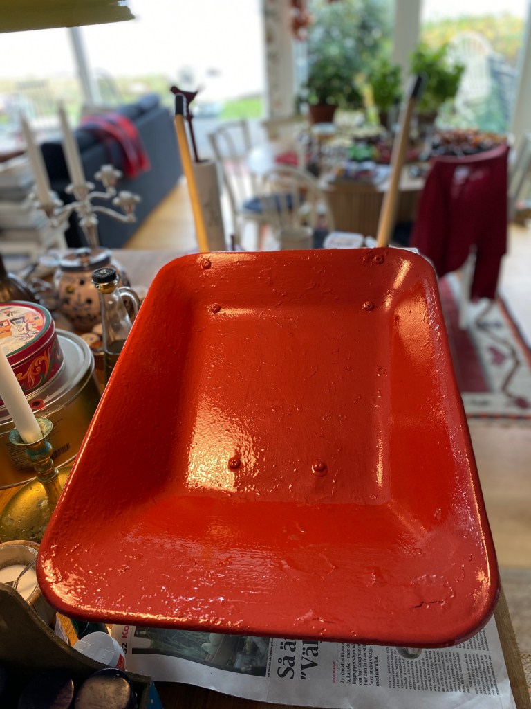 Han oljade också noga in själva flaket. Farmor däremot var kanske inte lika noga med underarbetet innan hon började måla på den röda metallfärgen som bonusfarfar snällt bytt ut från den gröna han först köpt 😉