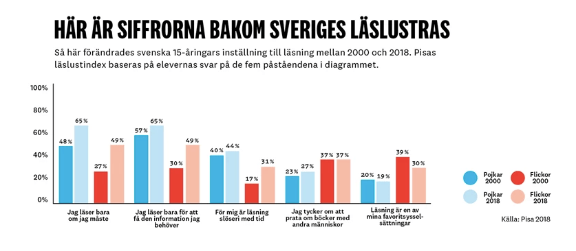 Dessutom har andelen elever som inte läser en hel sida skönlitteratur under en vanlig skoldag ökat drastiskt; från 44 till 81 procent i årskurs 6 och från 62 till 87 procent i årskurs 9. Det visar en ny rapport skriven av Mats Tegmark, Monika Vinterek och Tarja Alatalo som forskar i pedagogiskt arbete.I Sverige växer andelen 15-åringar som aldrig läser av lust näst mest i hela OECD, enligt en ny sammanställning och min slutsats är därför: