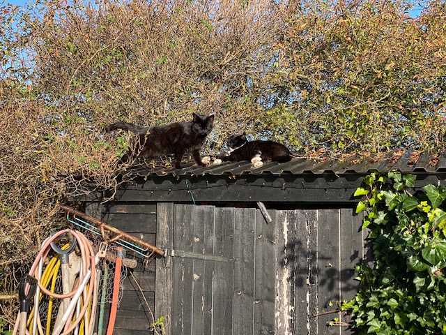 Han: Intressant notering om de tre årstiderna. Annars märks det att vi går mot mörkare tider. Katterna har flyttat in i stugan igen och sover länge på dagarna. Även om de som vi gärna dröjer oss kvar i den nedgående solen.