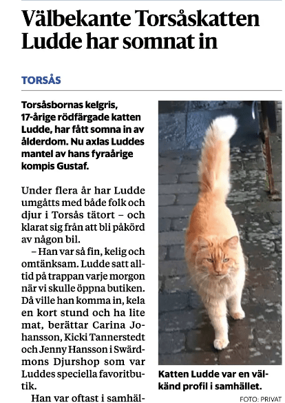 Det handlar om Torsåsbornas kelgris, 17-årige Ludde som somnat in. Ludde, som alltså inte ska förväxlas med vår svartvita Ludde på udden, höll till i byns centrum hela dagarna, berättar Barometern.