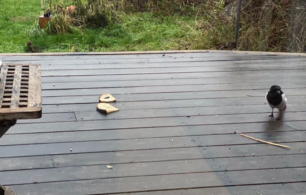 Vår lilla skata – som vi ärvt från en granne inåt viken – behöver inte stjäla. I enlighet med rådande kriminalvård och/eller humanismens principer matar jag den varje morgon med hennes hembakade bröd (gårdagens, nån måtta för det vara.)