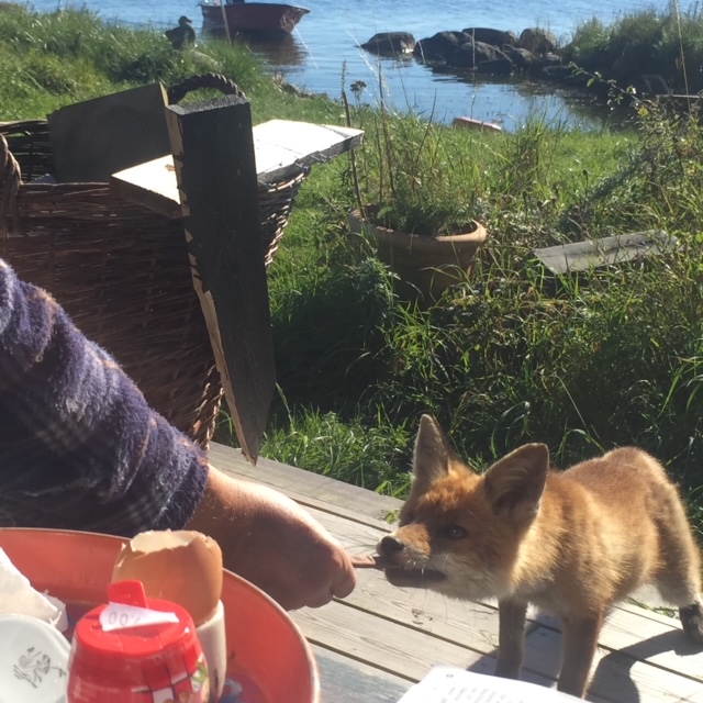 Den enda tjuvaktiga besökare vi träffat på här ute var en rävunge som stal både skor och mina glasögon (trots att han fick mat). Ändå vet minsta barnbarn att det just är skatan som är tjuvaktig. Man brukar säga att det krävs en tjuv för att känna igen en tjuv och kanske är det förklaringen. Vi människor känner igen oss i Pica Pica. Även vi retarderar till gratisätare – t ex när vi flockades på ICA Maxi Kalmar härom dan bjöd på nystekt vegetarisk korv.
