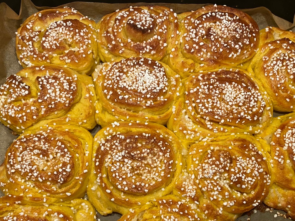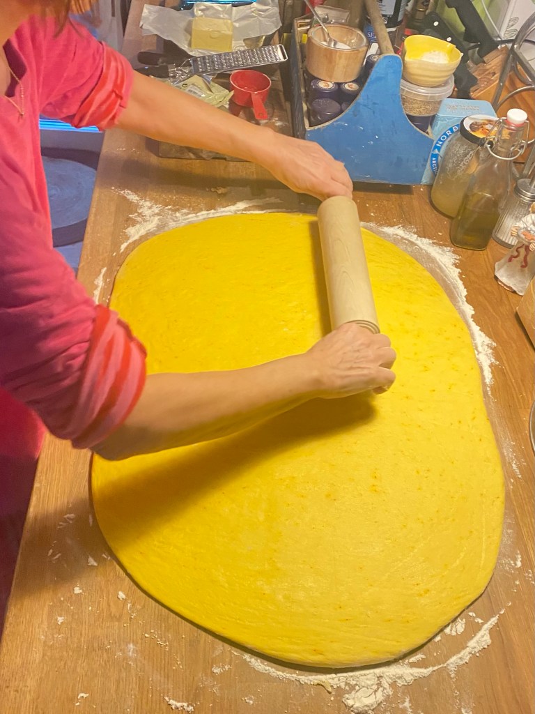 Men istället gick jag upp och började förbereda saffransbullarna som han efterfrågat. Började bra, degen jäste fint. Satte en pastadeg och en smördeg till mammas finnkransar under tiden. In i kylskåpet med båda!
