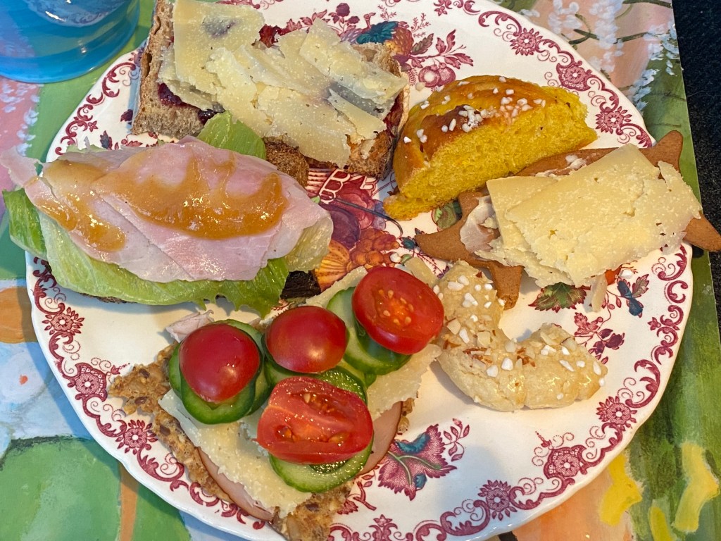 Min frukosttallrik visar också tydligt att det lackar mot jul, halva tallriken består av kakor… och då har jag inte tagit något av frukt- och nötkakan idag. Och jag har inte heller bakat den viktigaste julkakan än, masarinkakan.