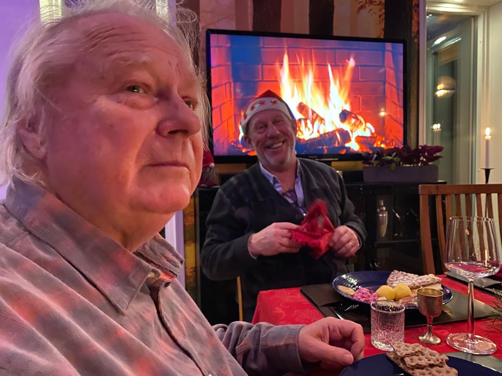 Vi började julafton på udden med en lång och stillsam frukost i soffan. Läste morgontidningarna och kollade sista avsnittet av årets Julkalender. En av de bättre någonsin. Han tog traditionsenligt en morgonsnaps för att smaka av årets julsnaps. Sedan fortsatte dagen nyktert med Kalle o co, förstås, och förberedelser inför avfärden mot Södra Kärr vid fem.
