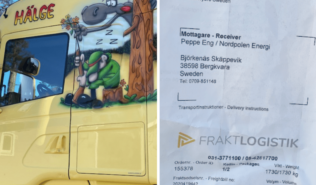 Jonas från Widéns åkeri i Nybro ringde nämligen strax efter 2-0 och sa att han tänkte levererade våra solceller. Åkeriets motto är ”Vi levererar vad vi lovar” och det gjorde man. Efter tre månaders väntan kom äntligen våra solpaneler. Även om panelerna uppenbarligen levererats till fel person.