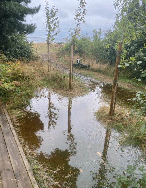 Större delen av den ”sjönära tomten” försvann, även om det ännu är en bit kvar till rekordet under vår tid på udden Enligt SMHI:s mätningar den 4 januari 2017 steg havet den gången 105 cm i Kalmar, men enligt våra amatörberäkningar 154 hos oss. Då såg det ut så här på udden: