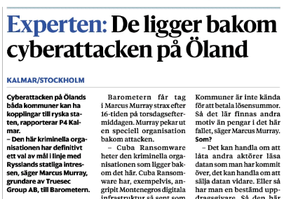 … men tyvärr har vi flyttat till en udde som ligger mycket nära de STORA nyheterna. Tvärs över sundet. Cyberattacken som slog ut Ölands båda kommuner har kopplingarna till Putin via något som heter Cuba Ransomware.