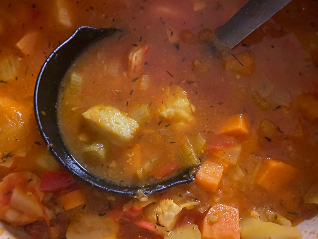 Fisk, räkor och infrusna tomater hade jag också. Köpte en sötpotatis och ett fänkålsstånd till kvällens fisksoppa. Den blev jättegod, min chili(fisk)blandning är verkligen en supergod krydda. Just det, köpte jäst också så jag kunde baka några baguetter till soppan. Gjorde en ljus surdegslimpa igår. Helt misslyckad. Måste få igång surdegen igen efter julhelgen, den har gett upp… Skärpning även på det området!