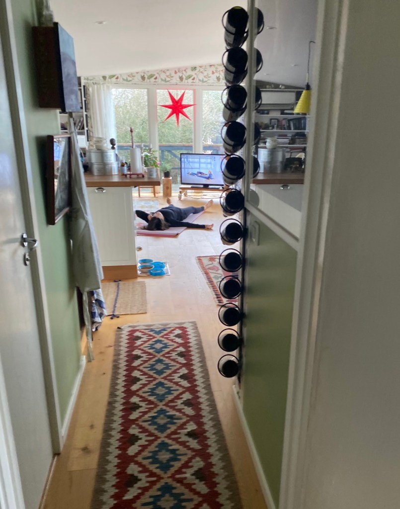 Hon: han får inte tjuvkika när jag gör yoga utan är förpassad till sovrummet, men uppenbarligen gjorde han det ändå idag… som tur var i slutet så det störde inte så mycket. Och jag fick ett bildbevis: