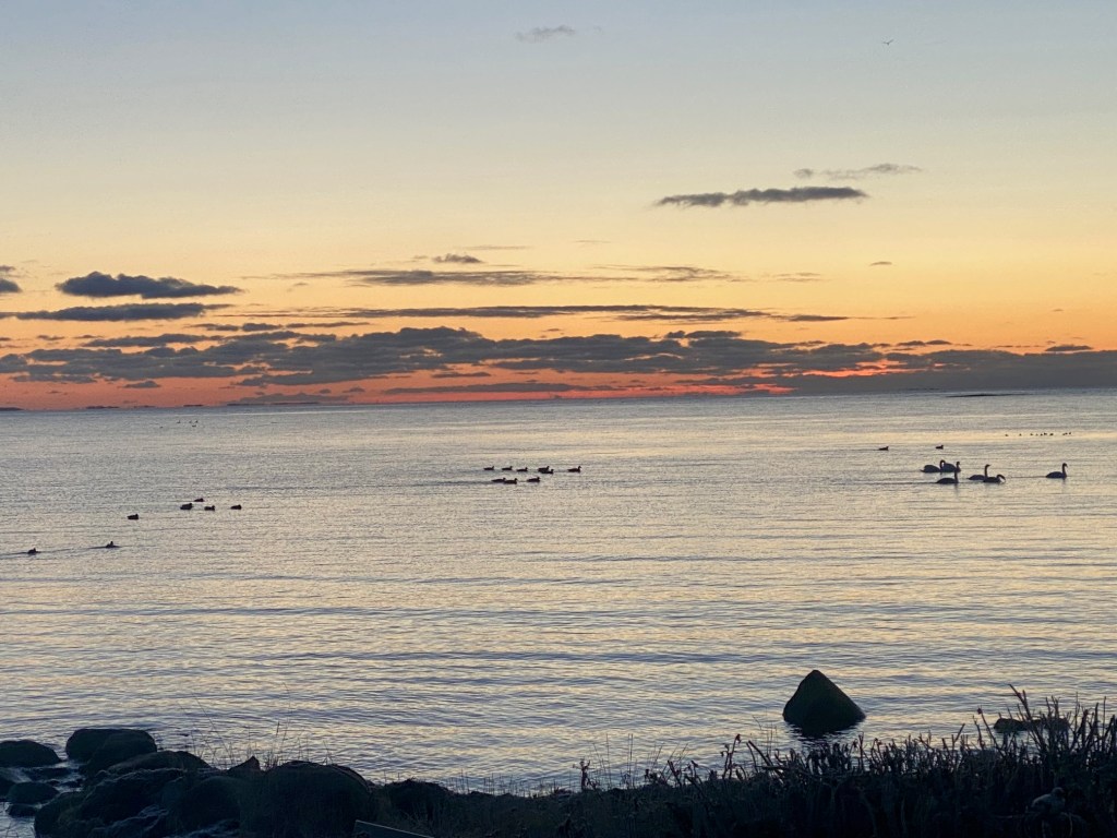 Av nån anledning är kolonin av svanar och änder på väg runt udden.