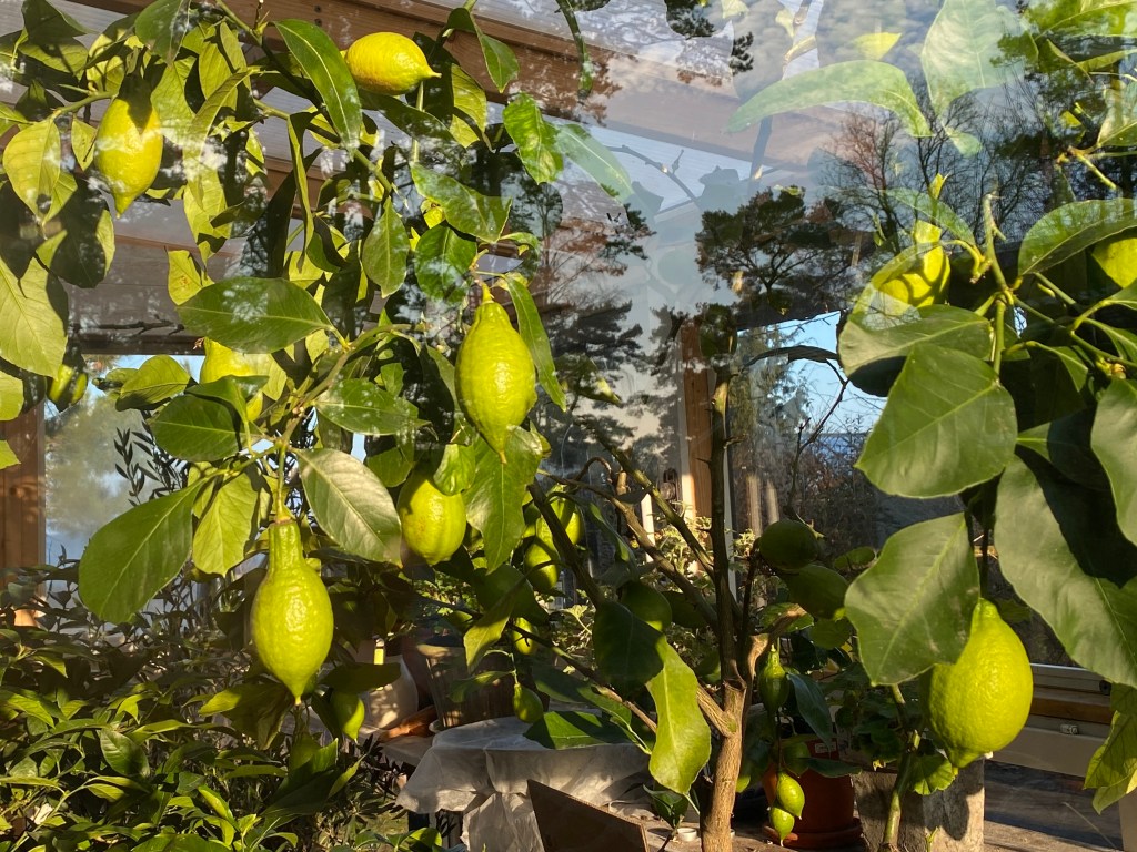 Men gladast var nog citronträdet inne i växthuset. Solen skiner in och värmer upp. Det har fått stå ut med mycket lägre temperaturer denna vintern, elpriset … förra året höll jag temperaturen på minst åtta grader, i år har jag bara satt på värmefläkten när temperaturen har gått under nollan. Trädet har tappat många blad men citronerna växer och verkar må bra. Grenarna är tunga av mängder med frukter.