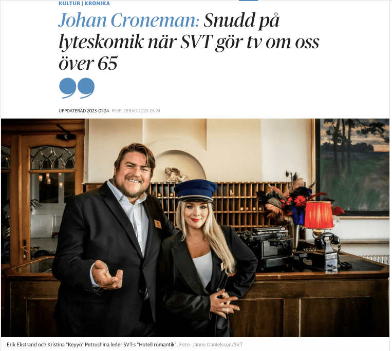 Det är bra att de stora tv-kanalerna äntligen gör tv för sina tittare och inte för de tittare man önskar att man hade. Därför bör man även låta målgruppen spegla produktionen. ”I stället för såpatrams vore det bättre att låta de äldre journalisterna själva stå för hantverket”, skriver Johan Croneman (67) i DN och vår argaste tv-kritiker är skarp som ett gammalt rakblad: ”Hotell Romantik gränsar till lyteskomik, inte för att det handlar om äldre, utan på grund av hur de unga programledarna ser på de äldre”.