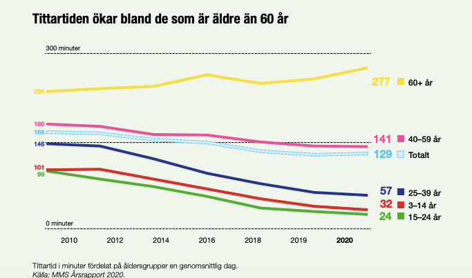Man kan vända på det. ”Äldretrenden” är ett försök att göra en dygd av en nödvändighet. Den krassa verkligheten är att tv-publiken blir allt äldre, somliga kallar oss ”sistagångstittarna”. Andelen som tittar på gammel-tv minskde under 2020 till 55 procent av befolkningen. MMS som mäter mediekonsumtionen skriver: ”Den tablålagda tv:n når inga nya tittare utan ökningen av tittandet sker hos de som redan tittar mest, de över 60”.