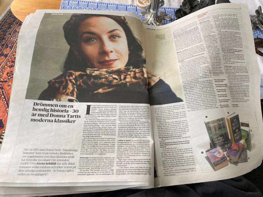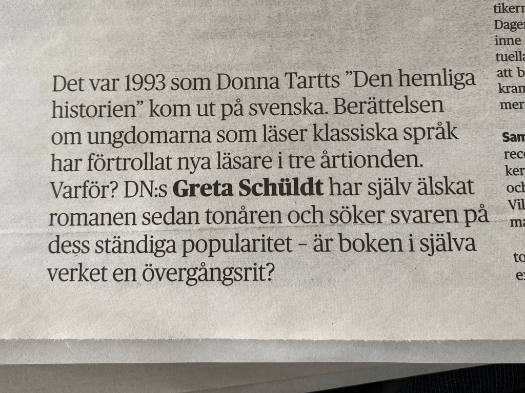 Igår var det en lång artikel i DN om Donna Tartts bok ”Den hemliga historien”. Jag har tidigare läst ”Steglitsan” av samma författare och blev förstås nyfiken när nu en annan av hennes böcker höjs till skyarna och beskrivs som en klassiker: