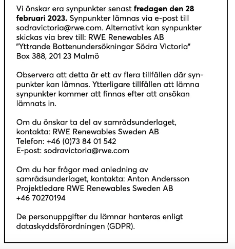 Han: I september förra året noterade vi ett UFO (Unidentified Floating Object) utanför udden. Med lite hjälp identifierades farkosten: ”Tack vare den tredje statsmakten vet vi nu att de senaste veckornas sjömätning utanför udden är en del i vindkraftbolagets nya projekt ”Södra Victoria”.