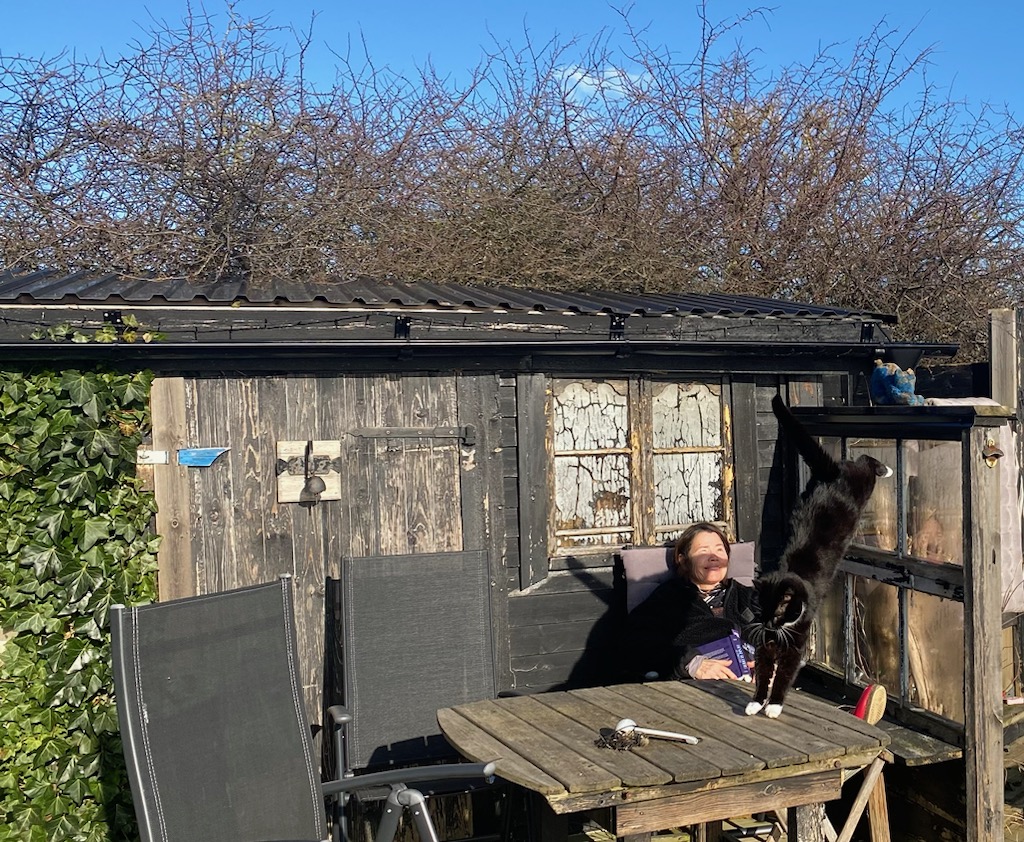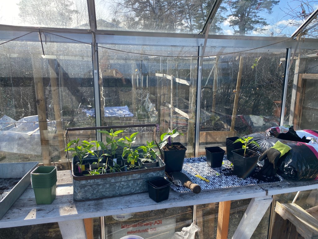 Och tack vädret för en solig och varm dag. Drygt nio plusgrader. Fast sjuuuukt blåsigt. Gäller att hitta lä, som vid sjöboden. Satt säkert en timme och läste. Sen var det premiär för omplantering ute i växthuset. Där var det över tjugo grader. Underbart att kunna stå där och jorda ner i stället för i köket…