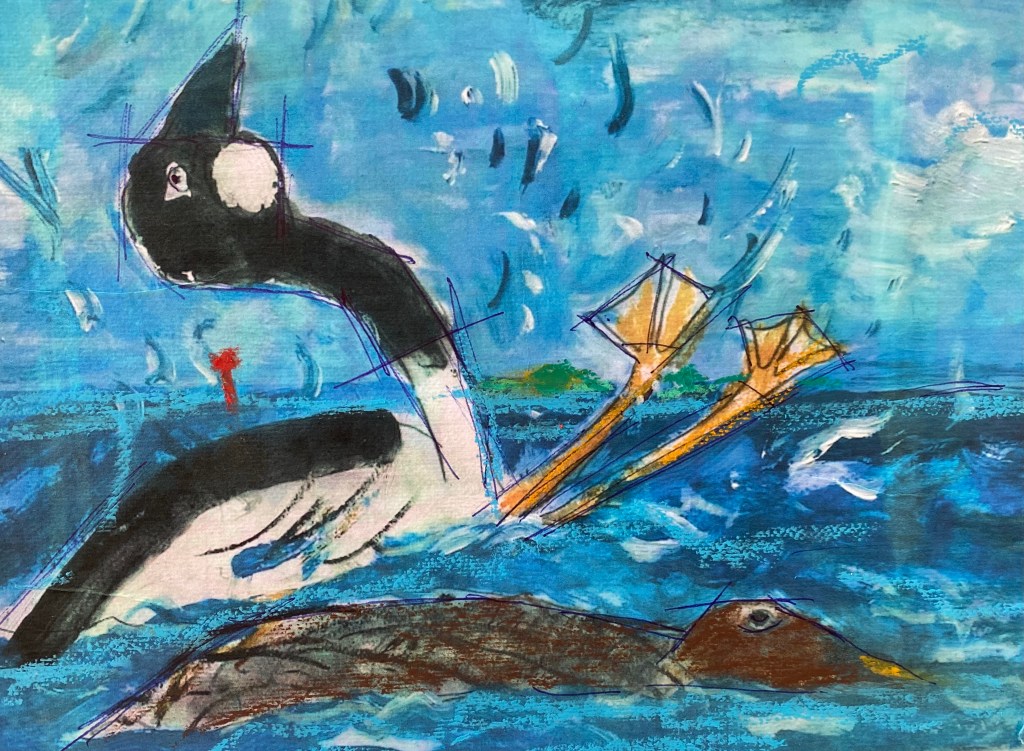 Fast den här andfågeln – som förekommer cirkumpolärt i Skandinavien – och som kallas skatand i Värmland och gnällvinge i Närke – får skylla sig själv. När han började var han ensam med sin hona, efter 45 minuters plaskande stormar hela havet av bensprattalande knipor och nu ser honan verkligen ut som om hon vill sjunka till botten.