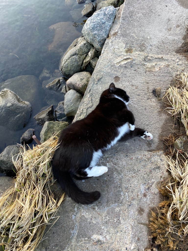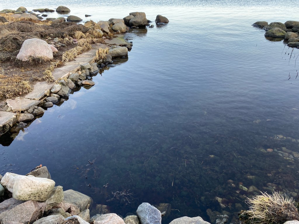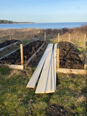 Tar bort tången som ligger kvar uppe på land sedan det var storm och högvatten, lägger det på landen så att ogräset dör. Funkar också som gödning. Kan säga att det finns mer att ta, hela viken är proppfull… men den får vänta till det blir lågvatten. Pust!