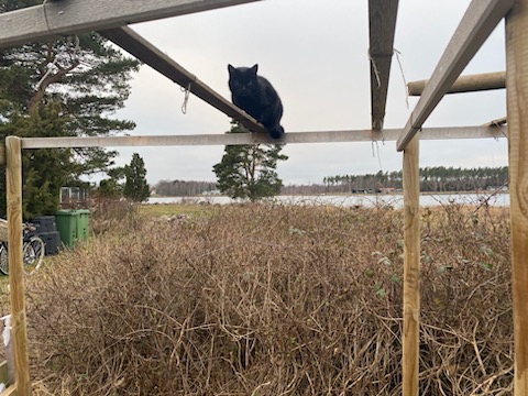 Dagens vårtecken: Hittade snödroppar utanför ateljén i Gökalund (nääää, inget målande; flyttade på sommardäcken och hämtade kap & gersågen). Hemma på udden märks det att vi går mot ljusare tider. Novemberkaktusen, som blommade storslaget i nov-dec, har knoppar igen och Vilda inser att hon måste hjälpa matte med att förbereda vårodlingen.