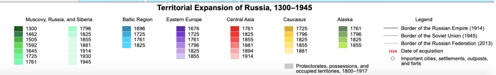 Tsarer med samma imperialistiska ambition: Ivan (1533 – 1584), Peter (1682 – 1725), Katarina (1762 – 1796), Nikolaus II (1896 – 1918), Stalin (1923 – 1953) och Putin (2008 – ?) .