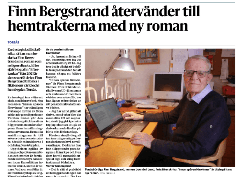 Efter självbiografin ”Eftertankar” från 2021 är den snart 91-årige Finn Bergstrand tillbaka i fiktionens värld och i hembygden Torsås.