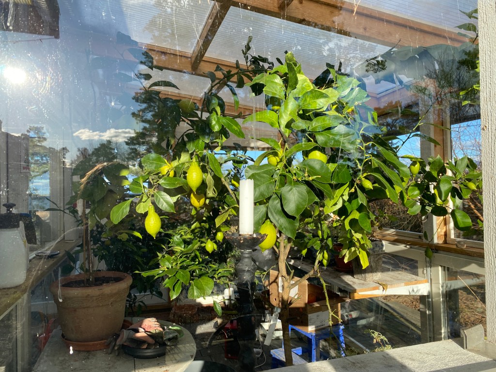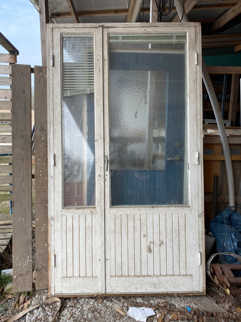 Hon: ja så ser den ut och ska ersätta två av fönstren på ”baksidan” av växthus 2. Då blir det enklare att flytta in och ut det stora citronträdet därinne. Förra sommaren fick det stå inne, och i år skulle det vara ännu svårare att få ut med alla citroner det har nu, om jag inte får en så stor altandörr att det bara gå att rulla ut.