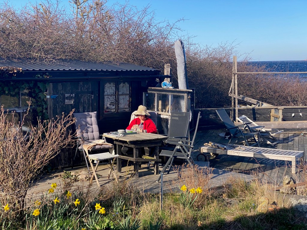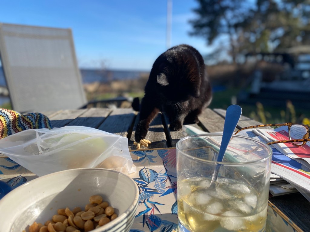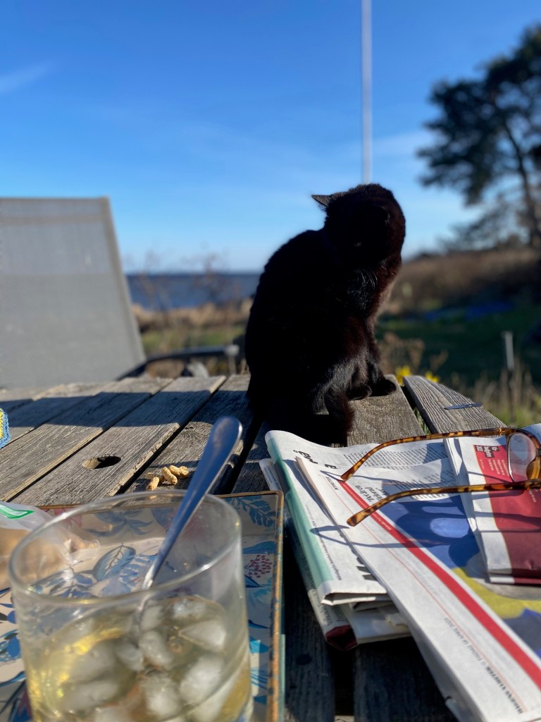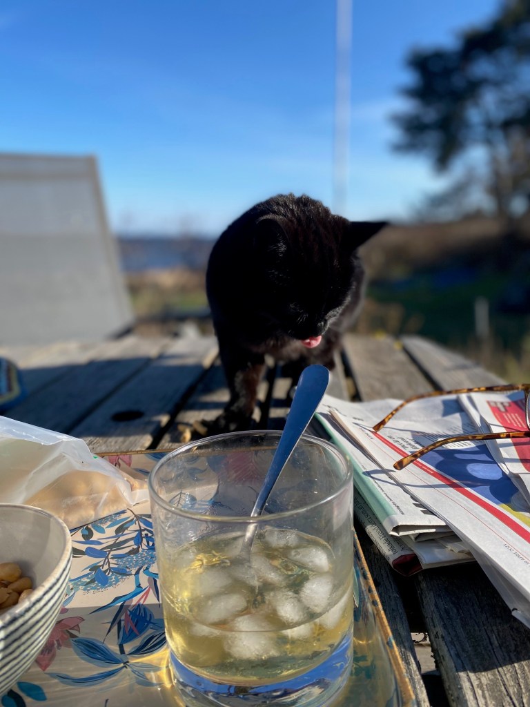 Och sedan firade hela familjen dagens segrar i lä vid sjöboden. Även om Vilda (nedan) var väldigt skeptiskt till tilltugget till eftermiddagsdrinken.