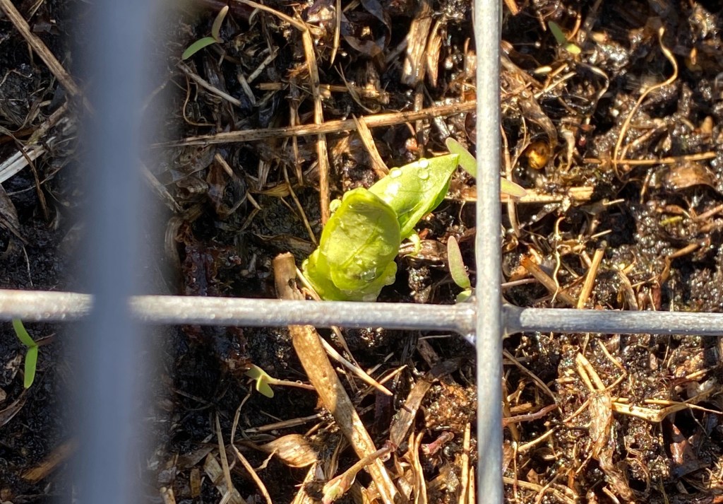 Sedan upptäckte jag att ett par av bondbönorna har börjat titta upp. Så glad, satte fröna lite för tidigt, det blev ett par rejäla frostnätter efteråt och fröna jag satt i år är en italiensk sort som inte är lika köldtålig som den svenska. Så hurra!!!