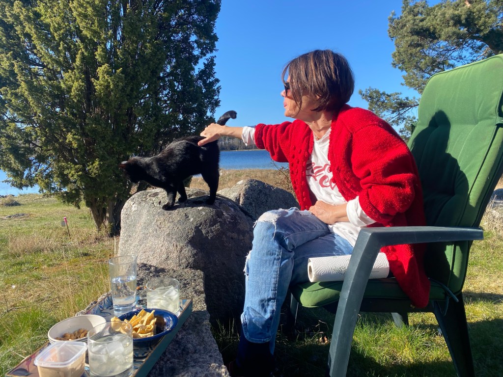 Hon: äntligen kunde jag säsongsinviga planteringsbordet ute. Och äntligen kunde vi ta drink vid stenen, med utsikt över viken, utanför Chateau Margareta igen. Inget fel med drink vid sjöboden och utsikt över horisonten, men att slippa den hårda och kalla nordanvinden som blåst i en evighet var underbart. Vilken dag, tack!