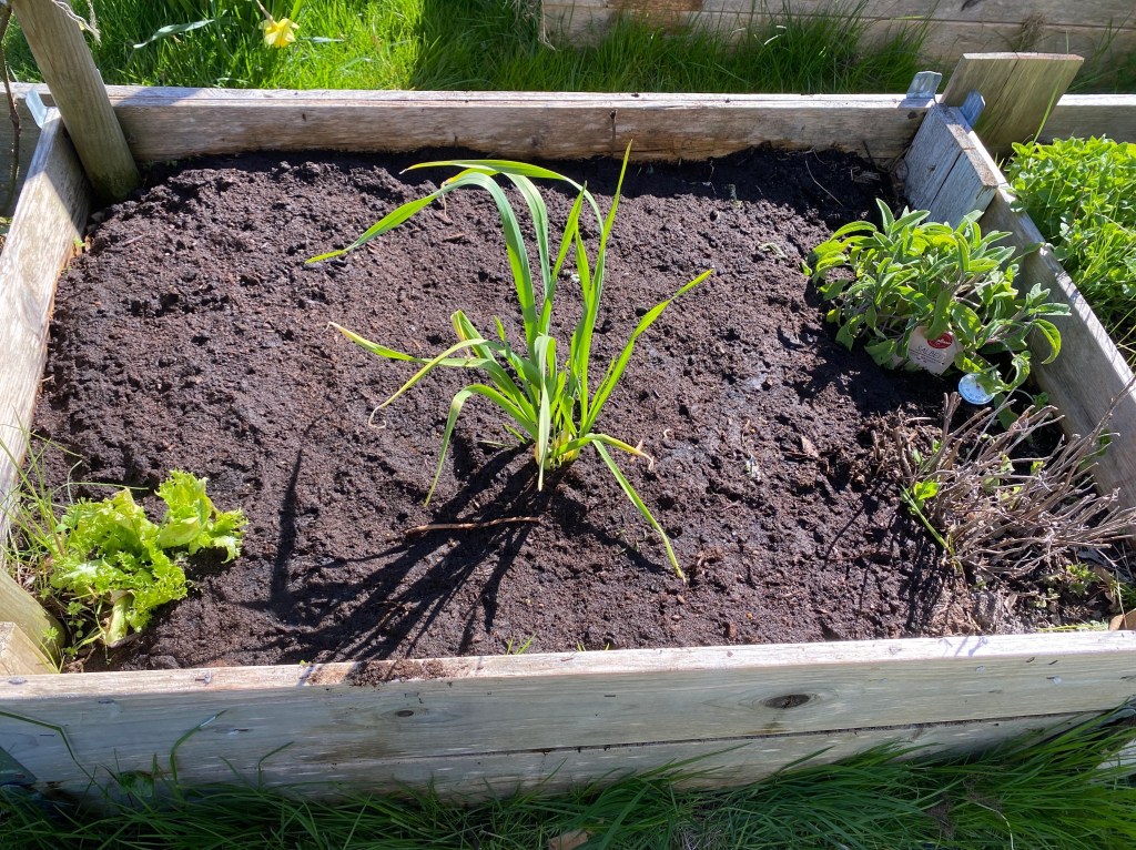 Lite sugarsnaps kom också i jorden intill kryddlandet. De får samsas med en förvirrad bunt med vitlök och salvian.