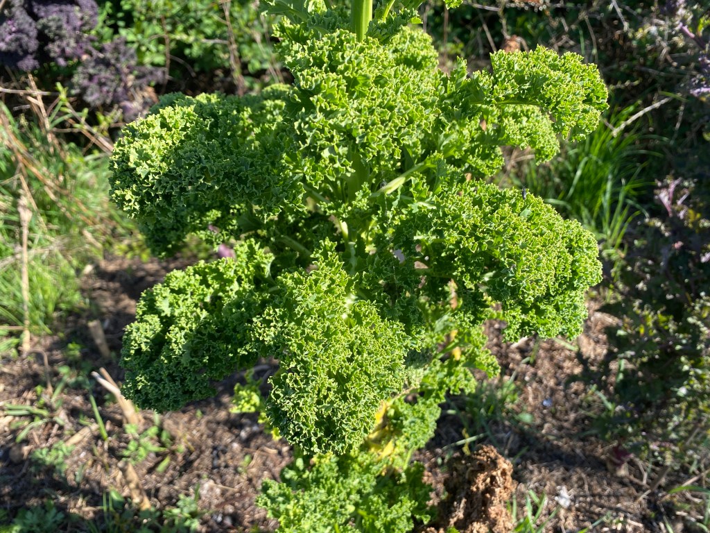 Årets övervintrare: Fjolårets grönkål, den växer fortfarande på och sätter nya blad på stammen: